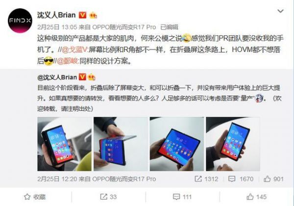 例如,早在2019年,当很多人以为目前只有三星和华为才能做出折叠屏手机时,OPPO副总裁沈义人就在微博上晒出了一组OPPO制作的折叠屏手机样张,证明OPPO也具备了生产这种手机的能力。