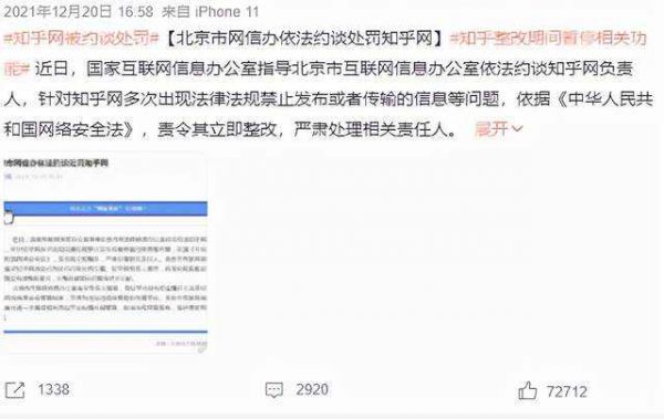 就在去年12月20日,北京网信办就站内“多次出现法律法规禁止发布或者传输的信息”等问题约谈知乎,要求其限期整改,并在整改期间内暂停相关功能的使用。对此,不少知乎用户拍手称快。