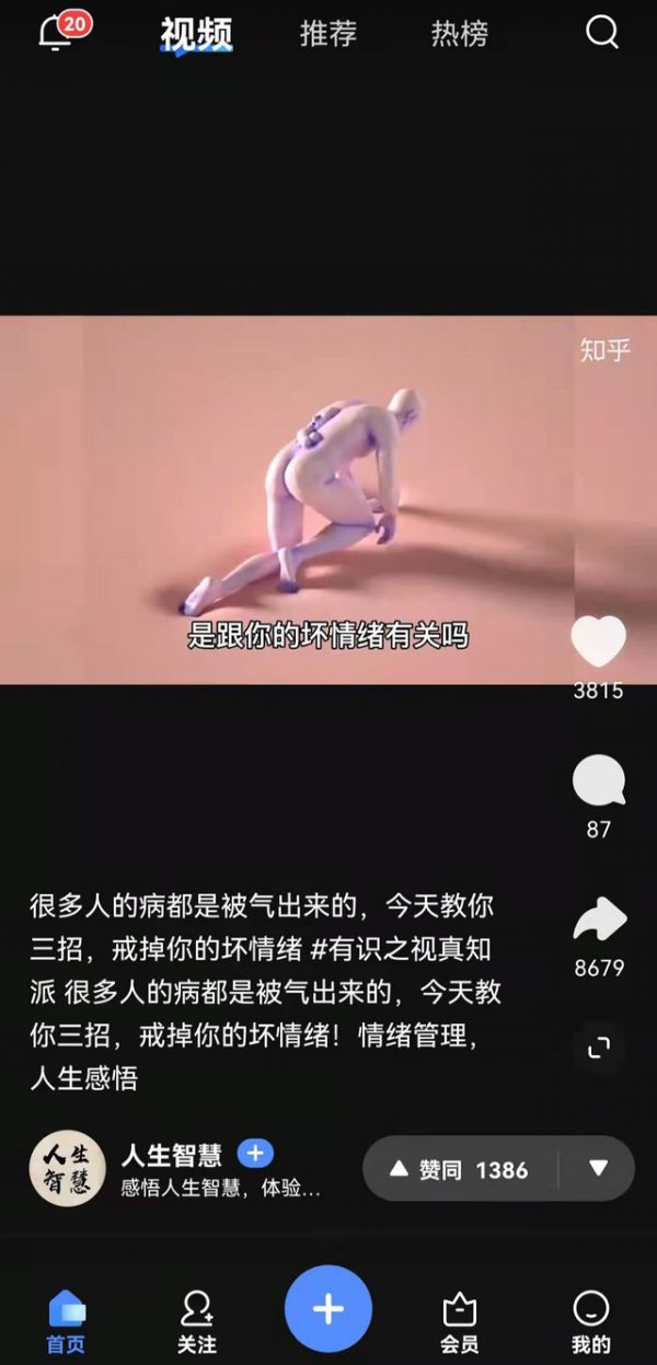在最新版本的知乎APP中,视频已经成为了主界面的三大功能之一,而视频内容也以知识类视频为主。