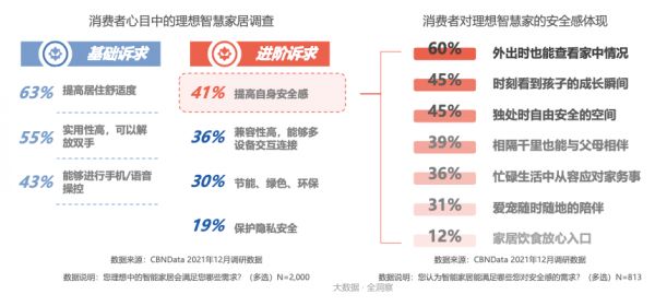 CBNData发布的《2021智慧家居趋势报告》中提到,消费者对于智慧家居的需求主要集中在:实用性高可以解放双手、能够远程操控、可以进行交互连接、提高居住舒适度,提高居住安全感等方面。其中超过4成消费者更加重视提高自身安全感的需求,而“外出时也能查看家中情况”,也被看作是提高自身安全感方面的一个重要体现。