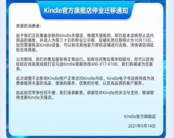 天猫Kindle官方旗舰店则早已关闭。网上流传的一份公告显示,Kindle天猫官方店于即日起停止商品销售,预计10月13日关店,落款为9月14日。