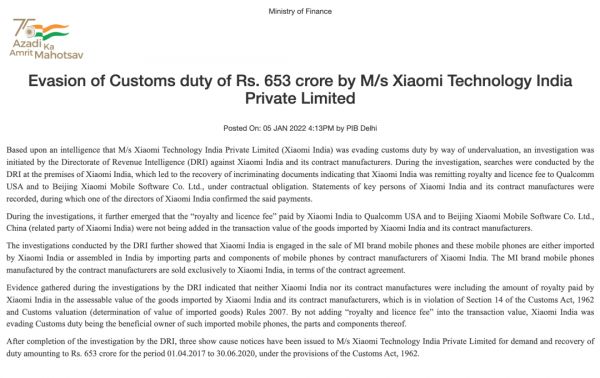 印度财政部表示,DRI调查期间收集的证据表明,小米印度及其合同制造商均未将小米印度支付的特许权使用费金额计入商品的评估价值,这违反了印度1962年《海关法》第14条和2007年海关估价(确定进口货物价值)的规则。