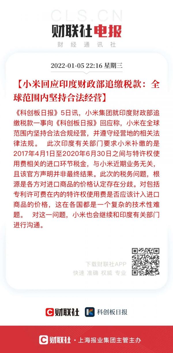 小米集团就印度财政部追缴税款一事向《科创板日报》回应称,小米在全球范围内坚持合法合规经营,并遵守经营地的相关法律法规。此次印度有关部门要求小米补缴的是2017年4月1日至2020年6月30日之间与特许权使用费相关的进口环节税金,与小米近期业务无关,且该官方声明并非最终结果。此次的税务问题,根源是各方对进口商品的价格认定存在分歧。对包括专利许可费在内的特许权使用费是否应该计入进口商品的价格,这在各国都是一个复杂的技术性难题。对这一问题,小米也会继续和印度有关部门进行沟通。