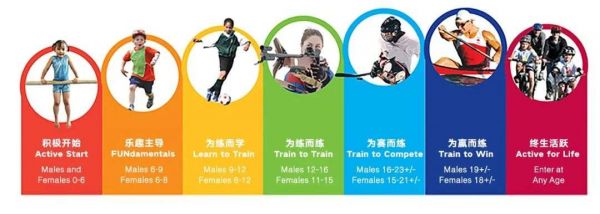 比如,加拿大国家教练协会 (National Coaching Institute)的 Istvan Balyi 在2005年提出运动员长期发展模型「Long Term Athlete Development (LTAD)」的七阶模型。在该模型中的前两个阶段,「Active Start」和「FUNdamentals」则突出了模型传递的理念:在学龄前阶段,要「乐趣主导」并且学习「基础动作技能」,抓住每一个儿童身体发育的敏感期。