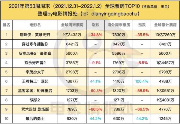 《蜘蛛侠:英雄无归》在元旦档成功收窄跌幅,截至周一北美票房超过6.21亿美元位居北美影史第9,最终有望挑战《阿凡达》7.6亿美元的第三名宝座。全球票房超过了《黑豹》的13.48亿美元成为MCU超英单人系列第一,成功捍卫了蜘蛛侠这一经典IP在漫威世界的领军地位。海外市场方面在印尼收入超过5000亿印尼盾为居影史第三位,印度收入逾21亿卢布成为好莱坞影史第三,在巴西截至周一累计超过2.35亿雷亚尔位为影史第四位,在英国以6985万英镑为影史第14位,最终轻松挤进前十。