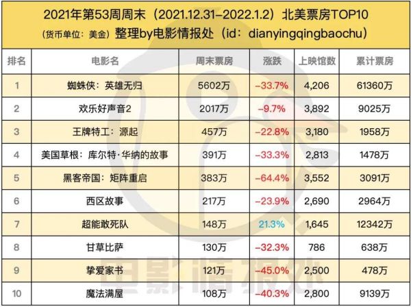 值得一提的是最终北美票房冠军《蜘蛛侠:英雄无归》将会是第二名《尚气》票房的三倍,这是《泰坦尼克号》《阿凡达》和《星战9》都无法达成的战绩,是自1959年《宾虚》以来62年首次,自《一个国家的诞生》116年来第三次。