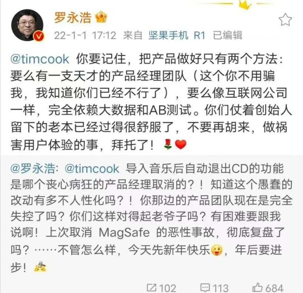 比苹果市值冲破3亿美元更早发生的,是2022年第一天锤子科技CEO罗永浩在微博上吐槽苹果缺乏创新的故事。