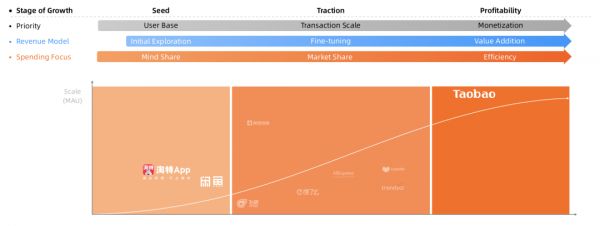 去年12月的阿里投资者大会上,阿里集团副CFO徐宏将阿里各个业务,分别划到播种、壮大和盈利3个不同的发展阶段。已经处于成熟盈利阶段的淘宝和天猫,需要考虑的是效率与效益的创新。