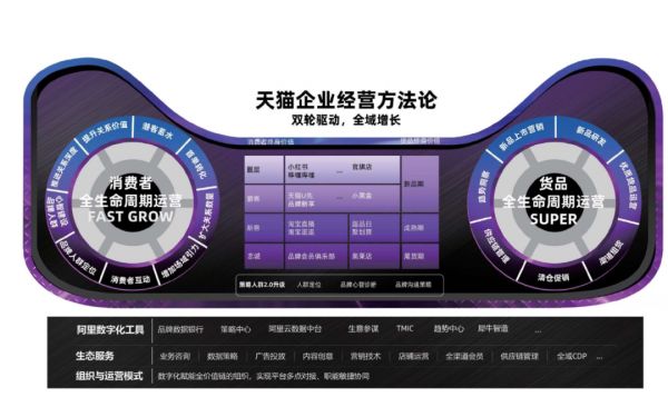 去年9月,天猫宣布自己成为一个D2C平台,同时还推出了一套「企业经营方法论」,提出“双轮驱动”的概念:一个轮子是消费者生命周期价值管理(CLVM),另一个是货品生命周期价值管理 (PLVM)。相当于天猫梳理出了十亿消费者的消费旅程,还抓住了品牌从商品研发到处理尾货的生命周期,帮不同行业的商家读懂人和货的规律。
