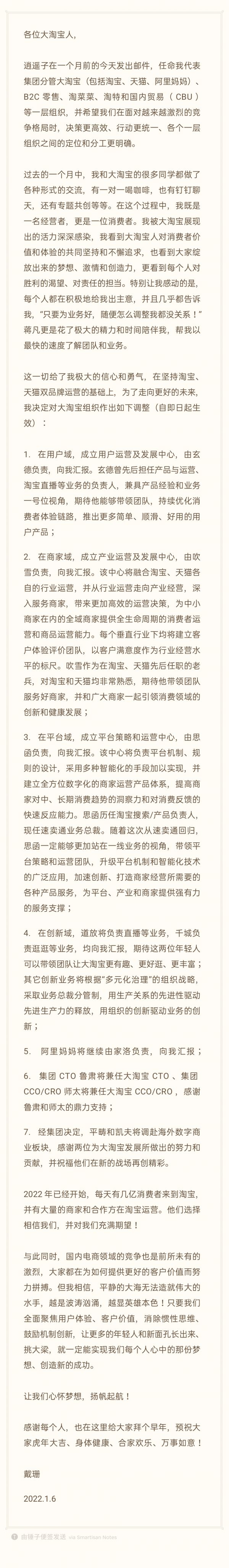 今日(1月6日),戴珊发布内部信,宣布阿里中国数字商业板块进行新一轮组织架构调整,调整重点是淘宝和天猫融为一体。