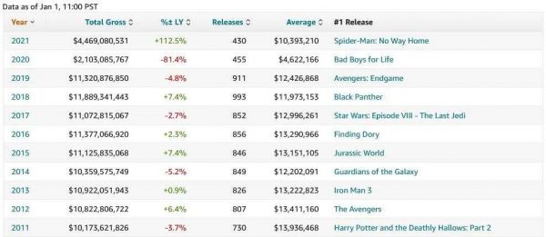 据IMDbPro统计,2021年北美全年票房定格于44.69亿美元,同比2020年的21.03亿美元回升112.5%。当然,与两年前的113.2亿美元相比,2021年仅恢复至四成左右,距离巅峰期仍相距甚远。