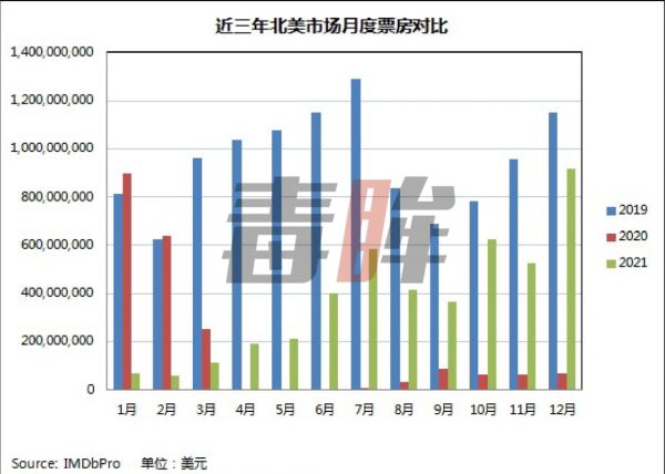 2021年北美总票房以近45亿美元收官,与两年前破110亿美元的高峰不可同日而语;但从下半年,尤其是第四季度开始,北美院线的复苏进度逐渐加快,到12月时已达到2019年同期的80%。