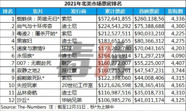 但若作更细致的分析,2021年北美放映的影片总数只有430部,甚至低于前年的455部。在动荡的市场环境中,各大片商的发行策略依然趋于保守,众多重磅新作均未如期亮相。