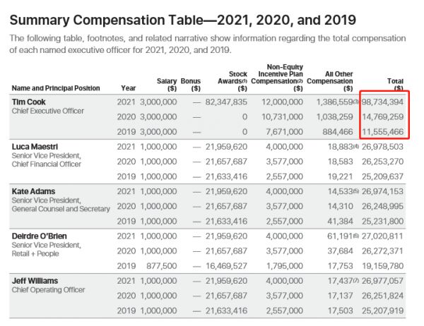 地表最强工资?苹果CEO库克2021年薪酬曝光,超6亿人民币