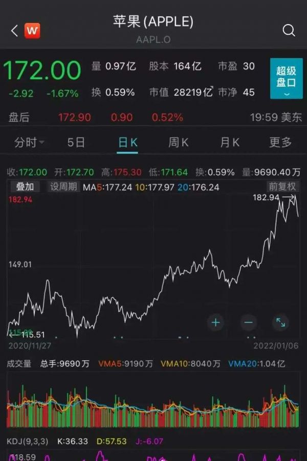 截至周四美股收盘,苹果报172美元/股,跌1.67%,目前总市值2.82万亿美元。