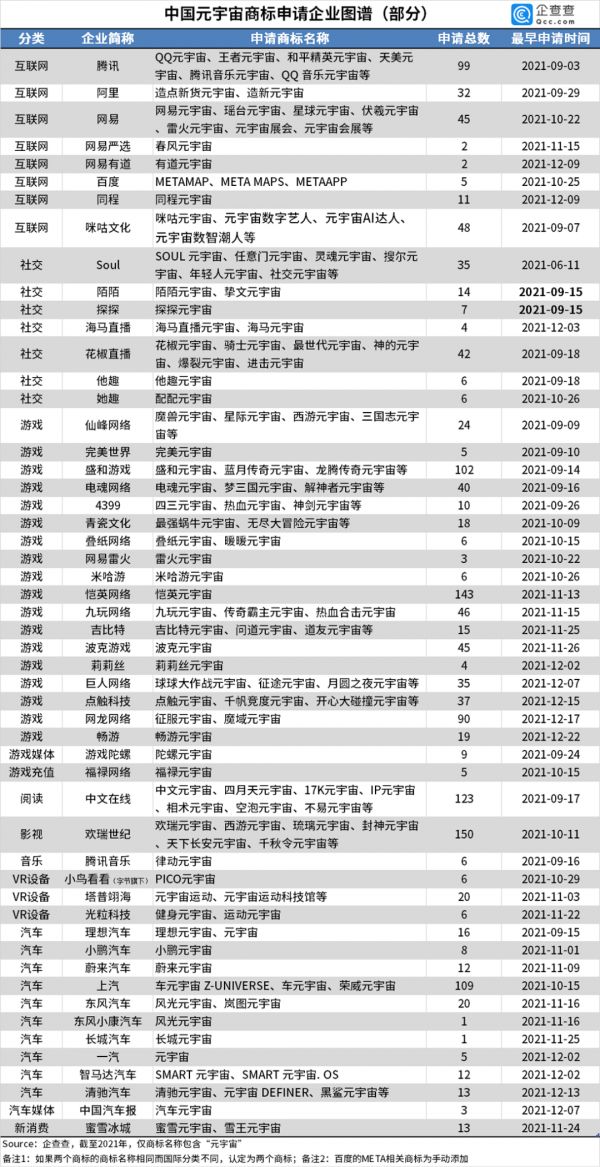 企查查数据显示,截至2021年底,我国共申请11376件“元宇宙”商标,涉及1692家公司。其中,99.9%的“元宇宙”商标是在2021年注册申请,包括11374件,涉及公司1691家。