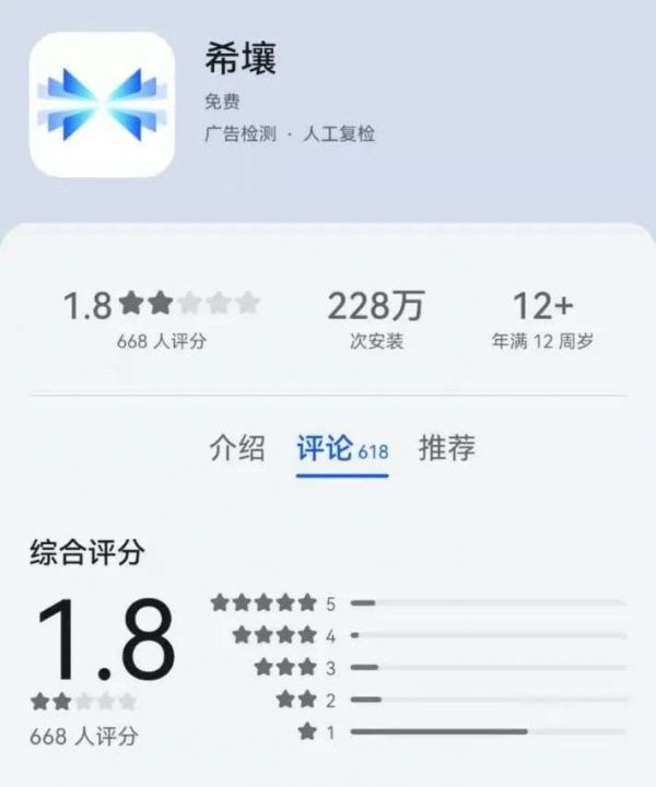 只是,正式上线后,评价却并不及预期。在安卓应用商店中显示,“希壤”APP共有228万次安装,668人评分,综合评分仅1.8分,给该产品打1分的用户远超其他。