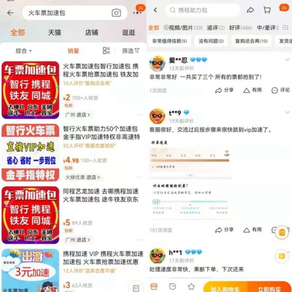 在淘宝上售卖加速包的评价中,有反馈购买后并没有用的吐槽,但大部分评价显示确实帮助他们抢到了想要的票。数据真真假假,但产品存活至今,让人不难相信其中一些人确实通过加速包抢到了票。毕竟虽然卖家精,但买家也不傻。