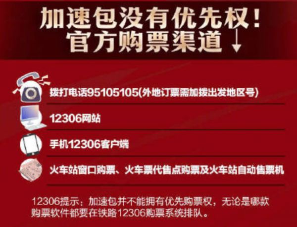 12306早已明确表示“加速包”并不能拥有优先购票权,无论是哪款购票软件都需要在铁路12306购票系统内排队。