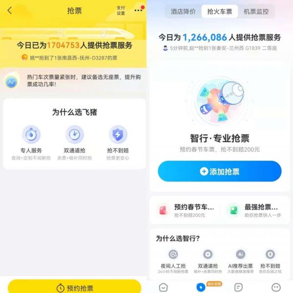 「新熵」发现,在飞猪平台上每日选择抢票服务的人数可达一百多万人,智行平台可达八十多万人。从顾客的使用反馈来说,目前处于两极分化状态。有买了也没抢到票的,也有买了确实抢到了票。