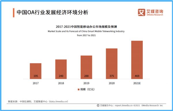 iiMedia Research(艾媒咨询)数据显示,自2017年以来,中国智能移动办公市场规模成稳步上升趋势。2020年中国数字经济总体规模超40万亿元,智能移动办公市场规模也达到375亿元,预计2021年中国智能移动办公市场规模将达469亿元。