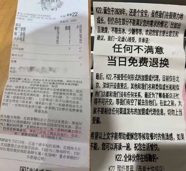 而新零售商业评论发现,就在北京,一家名为K22的茶饮店,复制了这份小票营销法,包括那句“等我们有空了就去告他们”。只是这份拙劣的模仿,收效甚微。