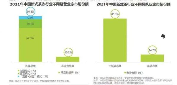 艾瑞咨询发布的《中国新式茶饮行业研究报告》显示,2021年,连锁品牌占据整个市场份额的90.8%,以蜜雪冰城为代表的中低端连锁品牌,有近50%的市场份额,此外,喜茶、奈雪的茶和乐乐茶等高端品牌,则有7.7%。