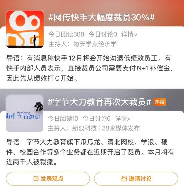 快手裁撤商业化团队人员。据报道,快手北上广深的商业化团队在年底前完成转型,部分业务线被取消,而剩余业务条线将在2021年12月底前将办工地点搬至杭州。员工被迫在搬家和离职中二选一。百度裁员主要聚焦于移动生态事业群组(MEG)和水滴筹。据称MEG事业部裁员涉及游戏业务团队300余人而水滴筹被裁撤的人员主要来自顾问团队和保险销售团队。