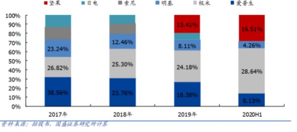 根据下图的国内市场各品牌出货量不难看出,坚果、极米已经快速抢占了消费级智能投影行业的市场份额。坚果在2019年迅速崛起,成为当年的一匹黑马,跻身前五。到2021上半年,坚果和极米出货量占比合计达45%。