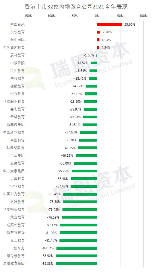 据瑞恩资本统计,截至2021年12月31日,共有32家来自内地的教育企业在香港挂牌上市。这32家个股去年有28家收跌,其中14家市值腰斩,仅有4家收涨。