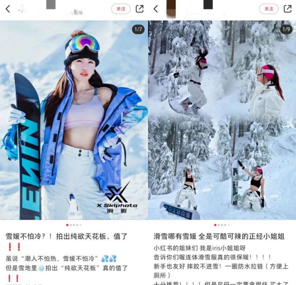 在小红书,共有42万+的滑雪博文,除了常见的新手滑雪指南之外,“雪媛”也成了最新的流量密码。她们要么穿着吊带背心,要么穿着JK短裙,极尽可能地配上嫩粉色的滑雪服和滑雪板,以各种姿势现身在全国各地的知名雪场里。