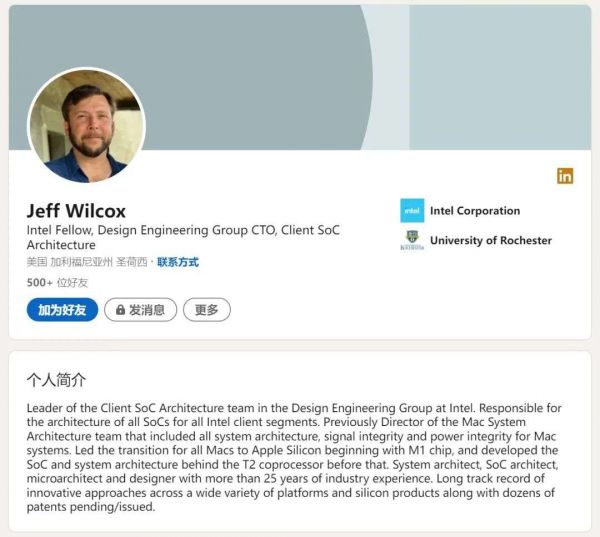 不过,与其说 Wilcox 是被英特尔“挖角”,莫如说是再续前缘。在 2013 年加盟苹果之前,他就已经是英特尔“老兵”了。Wilcox 曾效力于英特尔、英伟达以及马格南半导体,他在英特尔有过两次任职经历,总效力时间近 13 年。2010 至 2013 年期间,他是英特尔的首席工程师,负责英特尔凌动(Atom)的架构。