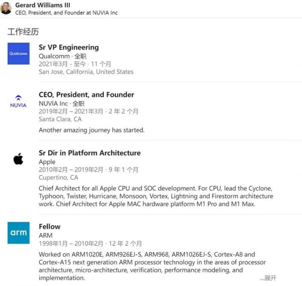 NUVIA 的创始人来头不小,Gerard Williams III 于 2010 年至 2019 年为苹果效力,曾是苹果 CPU、SoC 的首席架构师(Chief Architect)。加盟苹果之前,他还在 ARM 工作了 12 年。