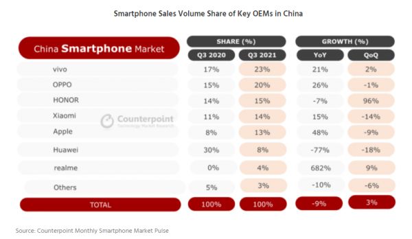 单飞后的荣耀成为2021年内的增长黑马。Counterpoint公布的2021年Q3中国市场出货量份额占比中,荣耀环比增长96%,以15%份额重回中国市场前三。