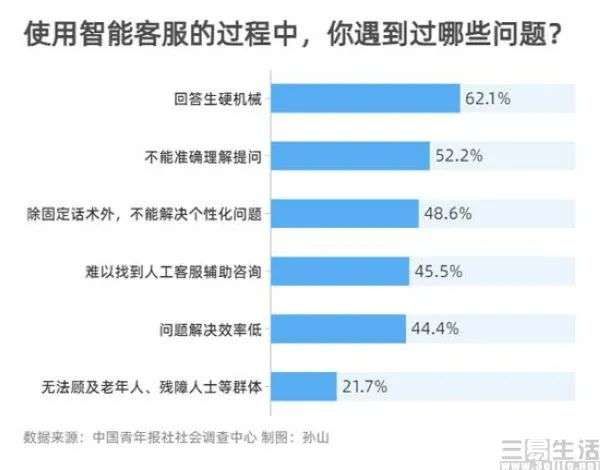 事实上截至目前,从互联网行业、金融业、快消行业,再到电信运营商,许多行业都已经普及了智能客服。然而如此普及的智能客服给消费者带来的体验却不甚美妙,同样是在中国青年报社社会调查中心的这次调查中显示,在使用过程中受访者遇到比较多的问题,分别是回答生硬机械(占比62.1%)、不能准确理解提问(占比52.2%),以及不能解决个性化问题(占比48.6%)。