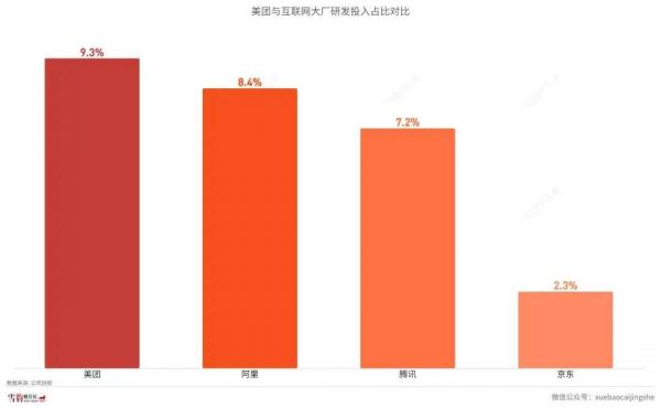 据工信部统计,2020年我国规模以上互联网和相关服务企业投入研发占比为6.2%。美团的研发占比也高于阿里(8.4%)、腾讯(7.2%)、京东(2.3%)等大厂。