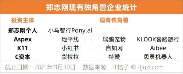 据 IT 桔子统计,郑志刚以个人投资者身份投资的独角兽为小马智行。除此,郑志刚也是蔚来汽车和京东物流的个人投资者,这两家企业分别于 2018 年和 2021 年成功实现 IPO;郑志刚以 ASPEX 作为投资主体,投资小鹏汽车、叮咚买菜、瑞鹏宠物、地平线、Klook 客路,其中小鹏汽车和叮咚买菜已完成证券化,现有独角兽为地平线、瑞鹏宠物及 Klook 客路,最新估值分别为 50 亿美元、44 亿美元、20 亿美元。