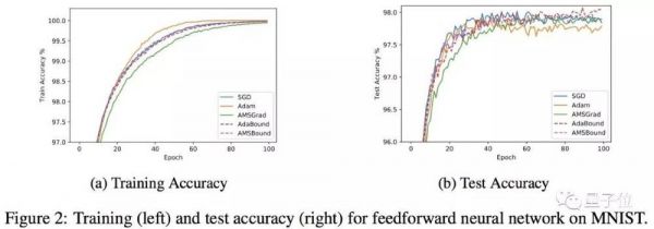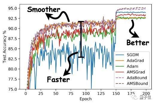 在这种情况下,AdaBound开始时就像Adam一样训练速度很快,随着学习率边界越来越受到限制,它又逐渐转变为SGD。