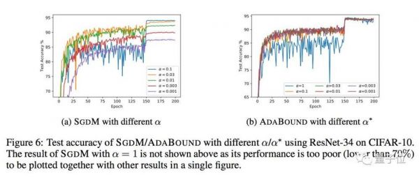 但使用AdaBound不代表完全不需要调参,比如上图中α=1时,AdaBound的表现很差,简单的调整还是需要的。
