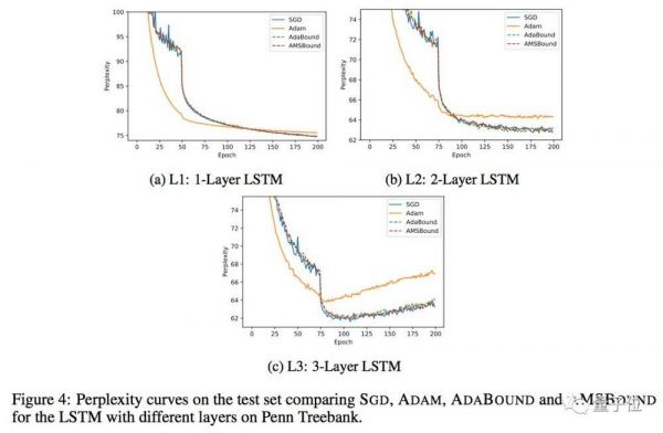 在LSTM上的实验则证明Adam更好的泛化能力。Adam算法在该实验条件下没有收敛到最优解,而AdaBound和SGD算法一样收敛到最优解。
