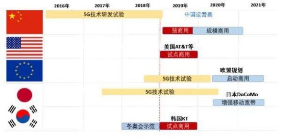 商用建设方面,美韩暂时领先,中国紧随其后。韩国和美国在2019年4月开启了试点商用,但美国商用的用户体验较差;中国预计从下半年开始发放牌照,预计在2020年将部署超过1万个5G商用基站。