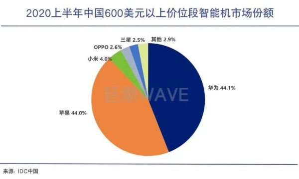 根据IDC的数据,2020年上半年,国内600美元以上价位段手机市场份额排名中,华为和苹果两个品牌占据了近九成的市场,达到了88.1%。华为以0.1%的优势领先苹果位居第一。