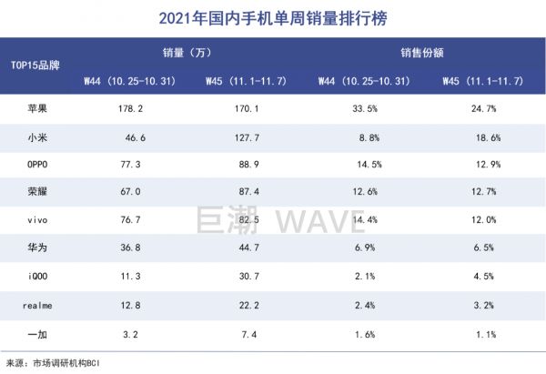 市场调研机构BCI公布的报告显示,双十一密集促销的两周(10.25-11.7),苹果在国内市场的销量均遥遥领先。