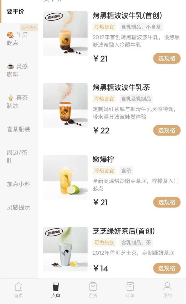 进入喜茶小程序,有“要简单”“要平价”系列。其中“要简单”系列里的7种产品均低于19元,纯牛乳茶15元/杯;其中纯绿妍茶后一杯仅需9元,这在喜茶产品定价中尤其引人关注。