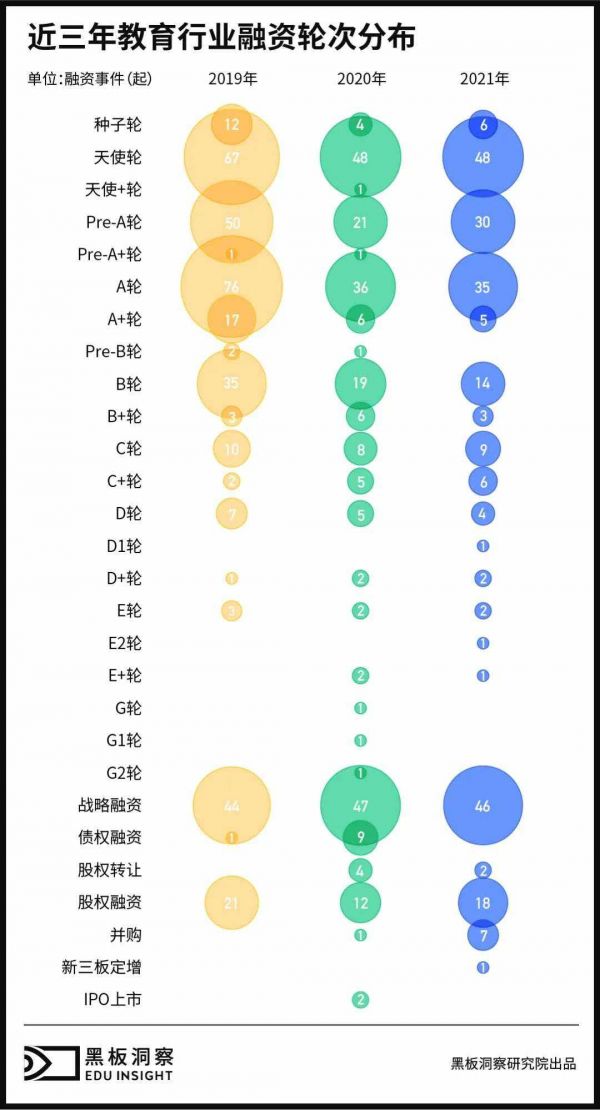 值得注意的是,在后期融资阶段,2021 年同样不少。据统计,2021 年教育行业共发生 7 起并购事件,远多于之前两年,行业洗牌速度进一步加快。但在教育去资本化的大背景下,各家企业对 IPO 上市更加谨慎敏感,这一年上市的企业并不多,仅有 1 起新三板定增事件发生。