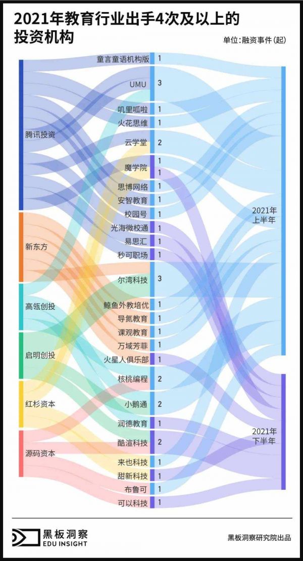 值得一提的是,这些投资较为活跃的机构中,选择出手的时机大多集中在 2021 年上半年,下半年则相对较少。其中,腾讯上半年出手了 10 次,累计投资了 9 家企业;新东方上半年出手 5 次,下半年投资了“火星人俱乐部”一家机构;其余几家机构下半年的出手次数基本都低于或持平于上半年。