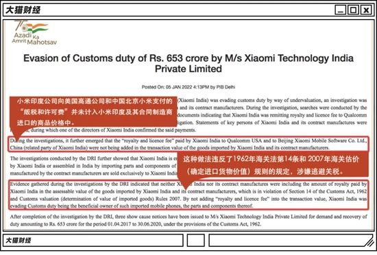 因为DRI发现,小米印度公司向美国高通和中国小米支付了特许使用费,但是没有计入进口产品的价值中,涉嫌违反1962年海关法和2007年海关估价规则。