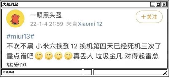 最近,小米12系列也开始销售了,大范围缺货的饥饿营销终于不再了,但还是遭遇到了翻车,一个被雷军翻牌的小米6钉子户,终于换了小米12,但是紧接着就出现了4天死机三次的事儿,这大概是比称为“钉子户”更闹心的事情了。