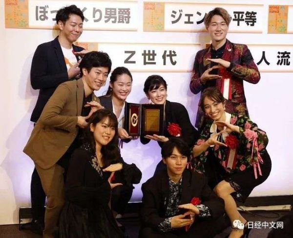 作为“Z世代”的典型代表而受到表彰的大空幸星(前中)等年轻人(2021年12月1日,Kyodo)