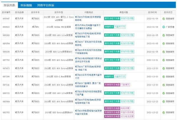 登录车质网,可以看到自去年7月以来,将近大半年的时间,消费者针对威马汽车锁电的投诉一直在出现,投诉的原因基本都是“威马EX5车型在系统升级后续航里程变少”“威马厂家未经消费者允许升级系统后续航减少”。